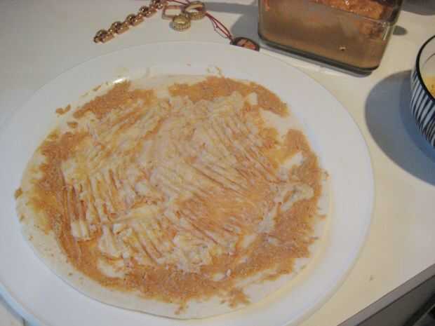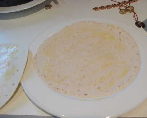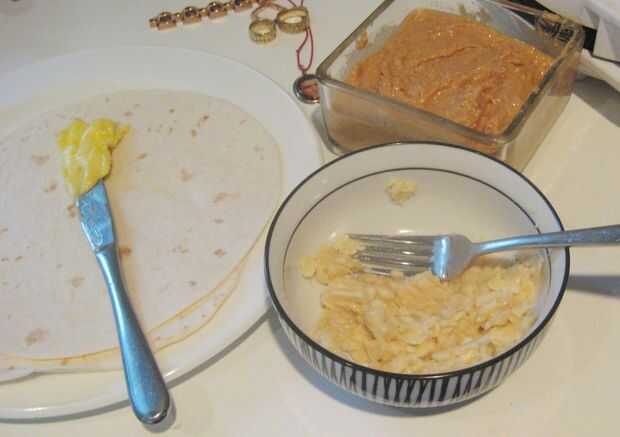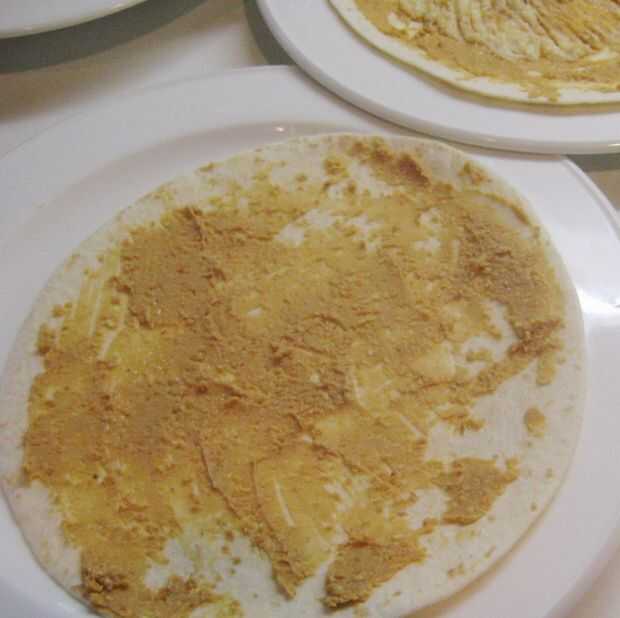 Mash the banana. Yo con mantequilla la parte exterior de las tortillas primero, pero yo debo han extendido la mantequilla de cacahuete y plátano primero por lo que tengo podría ponerlos juntos y luego con mantequilla la parte exterior.
