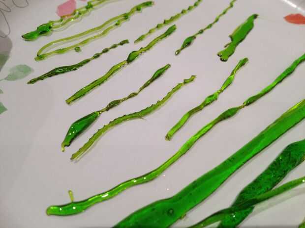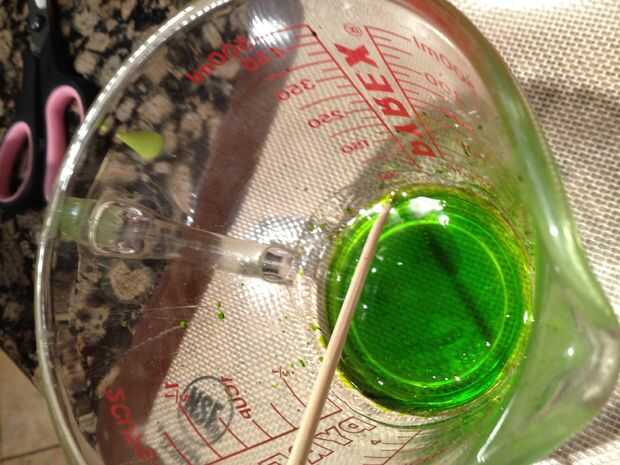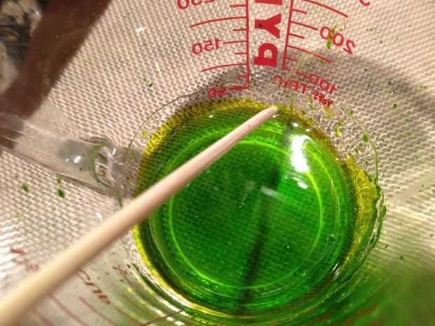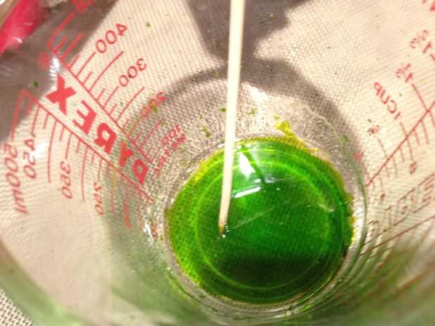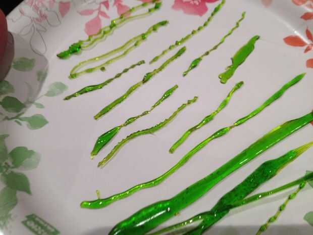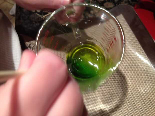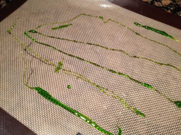 Una vez que se haya derretido, añadir el color y dejar chisporroteo, luego mezclar muy bien. Este fue mi 1ra vez con isomalt y cuando agregué el color, creo que estaba demasiado caliente y en serio parecía una escena de proyecto de ciencia de las películas... POOF y luego caliente salpica aterrizó en mí. lol. Miedo sh * t. Una vez hecho esto, verter sobre el silpat en líneas y tratar de hacerlas rectas.