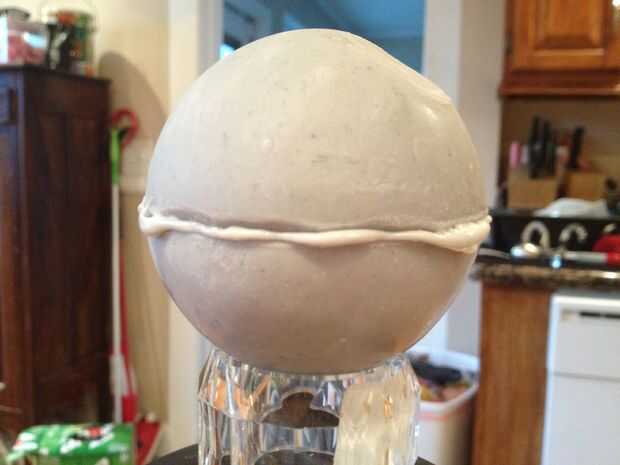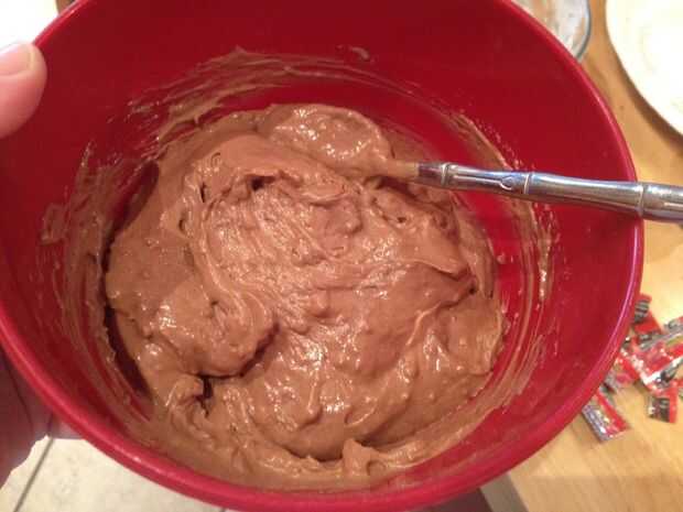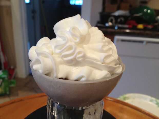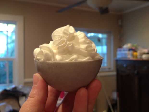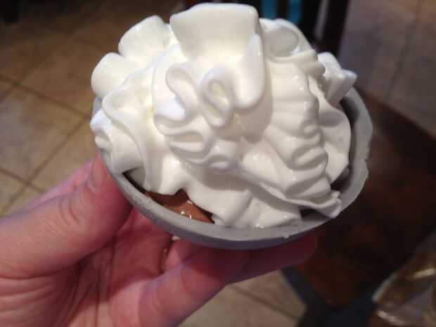Llené una cúpula más del camino y pongo alguna crema batida encima. Luego sumergió la otra cúpula en chocolate derretido y utiliza como pegamento, pulsa sobre el recipiente lleno y sellar el trato.