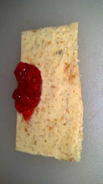 Agregue un poco de la mermelada de fresa, no demasiado o te aplasta hacia fuera.  Esto se convierte en la "carne" en los dedos.