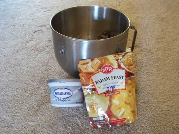 Luego años más tarde, una tienda India abrió sus puertas en nuestra ciudad y entre las cosas que he probado allí fue un paquete de sabor llamado "MTR Badam fiesta", destinado a bebidas lácteas y postres. Bien me soplan - era el exacto sabor que me acordé de Shrikhand. ¿Todo lo que necesitaba hacer era ahora trabajo en la textura, que a mi recuerdo había sido mucho menos como el yogurt y mucho más como la mantequilla, o... tal vez... queso crema? Pues bien, ¿por qué no? ... Probé con la fiesta de Badam y no podía creer que había tropezado en la receta perfecta al fin. Dado lo era algunos años desde que tuve, que esto fue exactamente la recordé!