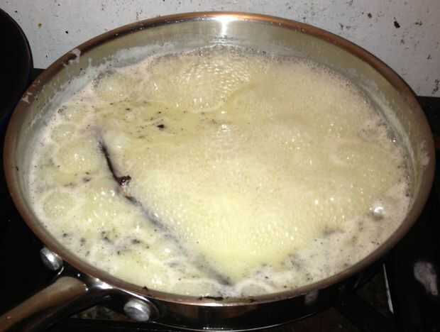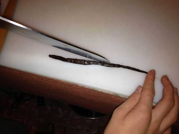 dividir una vaina de vainilla por la mitad de lo largo. Raspar hacia fuera la pulpa te como tripas y ponerlo todo en la mezcla de crema-agua-azúcar junto con el extracto de almendra.