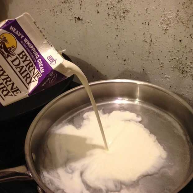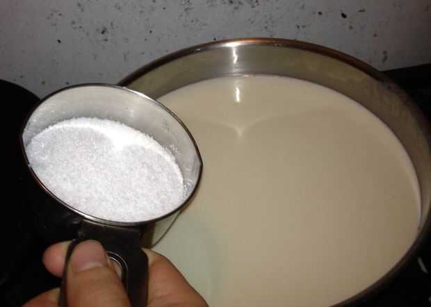 Añadir un 1/4 '' de agua en el fondo de una sartén a fuego medio. Añada la crema, mezcla bien. A continuación, agregue 1 taza de azúcar y