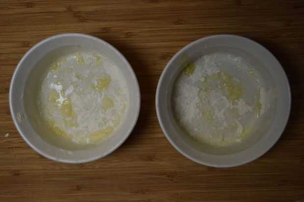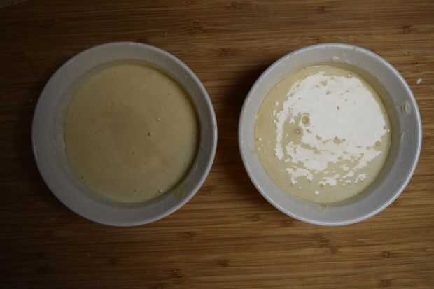 En primer lugar, ENMANTECAR y enharinar dos moldes de 16 oz. Entonces, vierta su preparado la masa uniformemente entre los moldes. Hornee a 350 grados (175 grados Celsius) hasta la parte superior de las tortas es dorada y un palillo insertado salga limpio. Deje el pastel en sus moldes durante unos diez minutos antes de sacarlos y apoyándolos sobre una rejilla para enfriar hasta su uso posterior.