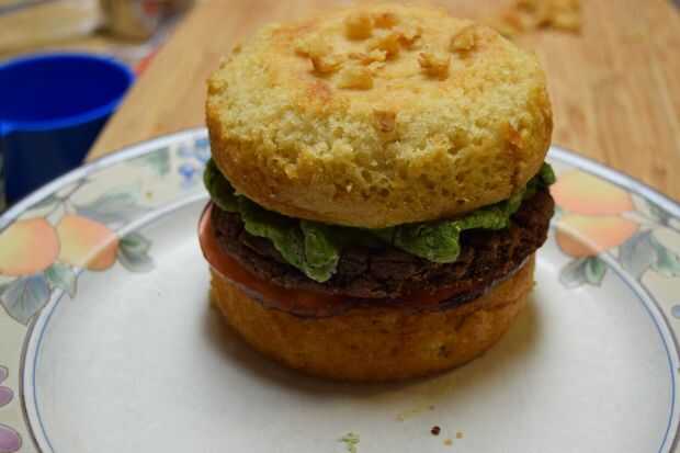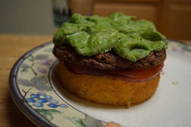 4. cubrir con la otra torta. Completa la parte superior de la torta un poco con un cuchillo y utiliza esas migas de exceso como semillas en la parte superior del bollo de pan.