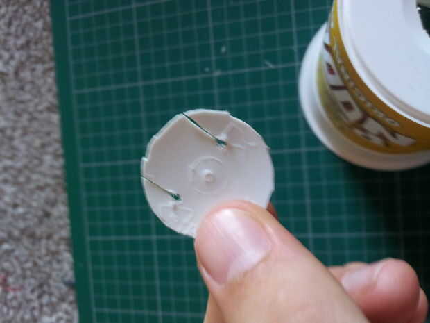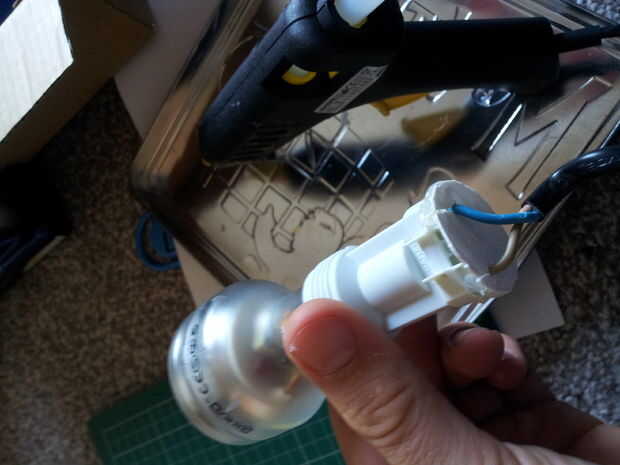cortar el círculo de la olla con su cuchillo. intente cortarse menos veces que lo hice. pero ten cuidado! necesita el círculo todavía!!!! hacer un corte adecuado o agujero para los cables que asoman a través en el pequeño círculo y péguelo en su lugar como se muestra. Ahora pegue el círculo pequeño (ahora adjunto para el sostenedor de bulbo) en la olla y listo es completa! prueba y solución de problemas si es necesario (esto probablemente implicará el martillo otra vez)