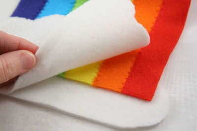 , Cortar una forma de nube de un trozo de lana blanca, luego la forma del espejo en un segundo trozo de paño grueso y suave. La nube debe ser sólo ligeramente más grande que el ancho del arco iris y aproximadamente 4" de altura. Coloque los pedazos de nube en frente y detrás del extremo del arco iris, cubriendo el borde del vellón.