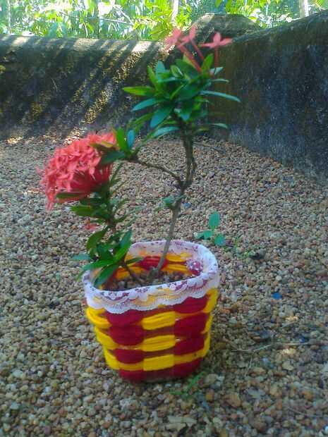 Podemos hacer una maceta sencilla y elegante para nuestro jardín de botella de plástico y cuerda plástica fina.