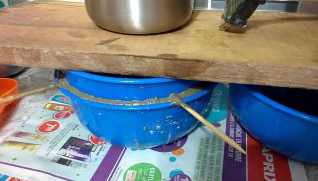 Verter el cemento en el molde exterior y presione la una interna en él hasta que los pinchos descansan sobre el borde externo de moldes y se obtiene el cemento aumentará a lo largo de los bordes a la altura que quería. Una vez que ya tienes, toque el molde un par de veces a nivel del borde superior, pesar el molde interno abajo con algo pesado y tratar de olvidarse de todo durante dos días. Digo "intentar" porque tenía un tiempo muy difícil hacerlo; esperando a demold y ver el producto final era muy difícil de hacer...