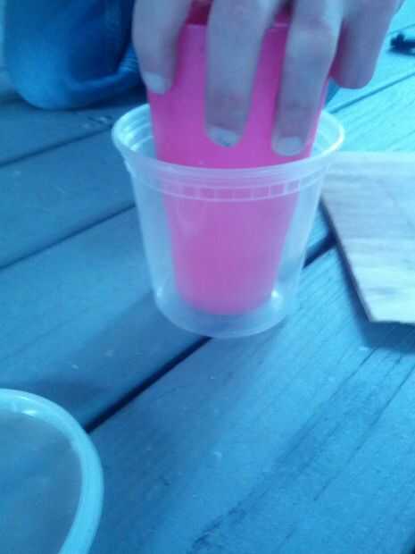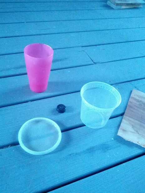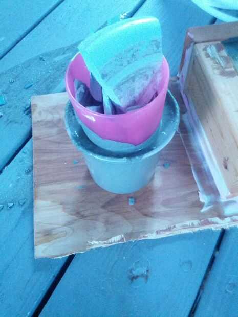 Para este proyecto utilicé elementos a mano, como un plato de comida china para llevar, un corte de pintura, una tapa de un refresco de 20 onzas y por supuesto, la ShapeCrete. Así que mientras que la imagen no puede ilustrar claramente, lo que tenemos es un plato de comida china, entonces la tapa del lado derecho set de 20 oz para arriba y más o menos centrado en el plato y la taza de la pintura centrado sobre eso. Sosteniendo la pila en su lugar, poner en el concreto premezclado. Utilizando algunas piezas desechadas de otros proyectos de intentadas para pesar abajo de la Copa, la dejé secar 24 horas el requisito.
