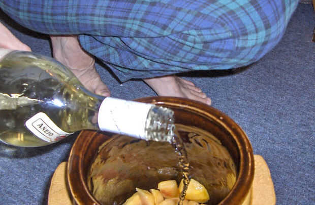 Remojar la fruta en la jarra de gres con Ron, el azúcar alternando fruta y Ron. Así que, básicamente, algunos vierte el azúcar, con algunas de las frutas, luego vierta algunas del ron. Esta repita alternando uno a otro hasta que todos los ingredientes utilizados para arriba.