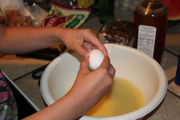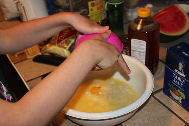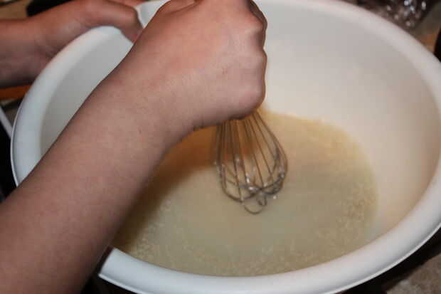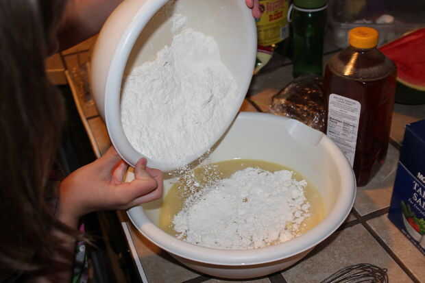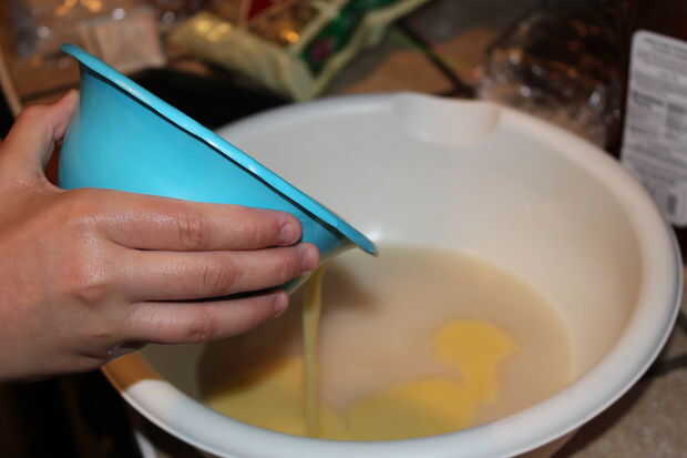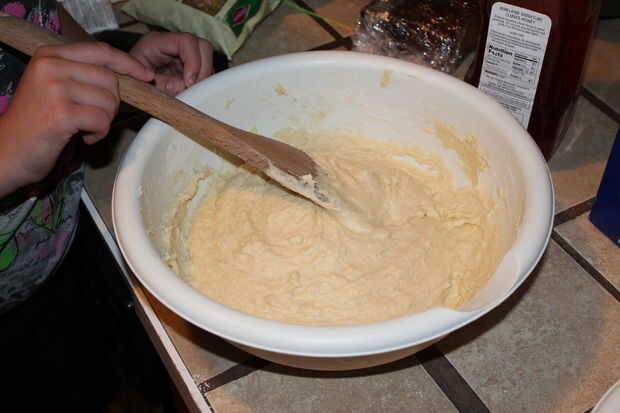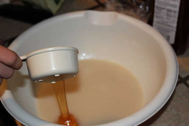 Agregue miel, mantequilla o margarina, huevos, patatas y 4 tazas de harina.