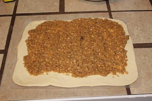 Mezclar las nueces, azúcar morena, mantequilla, huevos, vainilla y limón extracción (opcional). Esparcir la mezcla uniformemente sobre el rectángulo para dentro de 1" de los bordes.