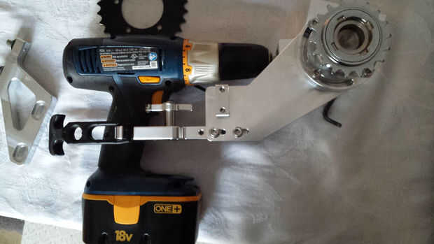 Este es el corazón y el alma a este proyecto, los taladros tienen un montón de energía para ofrecer pero que va por el camino correcto es el truco. Usted puede ir a conseguir un accesorio de ángulo recto y mod, lamentablemente no hago cosas así. A la CNC y torno con esta Asamblea. Carcasa de aluminio completo con engranajes de ángulo recto acero inoxidable 304 y de salida, a un simple piñón #25. La funda es un diseño de liberación rápida con ajustes. Porque hay una serie de ejercicios diferentes que se pueden utilizar. He diseñado así que encajo diferentes marcas y modelos de ejercicios, sólo cambian y cambio del soporte de sujeción para hacer diferentes ejercicios para adaptarse.