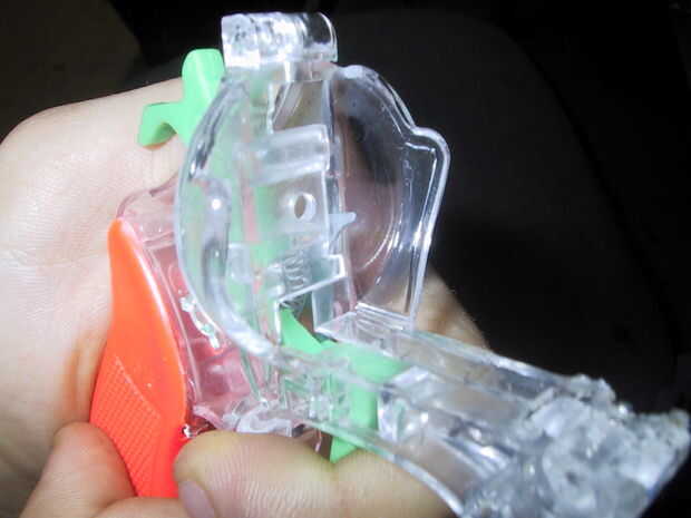 Aviso cuando el gatillo, que empuja a un estímulo de metal fuera del cuerpo de la pistola. también puede ser una palanca de plástico por debajo de la que atiza semejantemente hacia fuera. Queremos que la pieza de madera totalmente al ras del cuerpo de la pistola, por lo que debe tallar muescas en un extremo de la madera para dar espacio a estas piezas móviles.