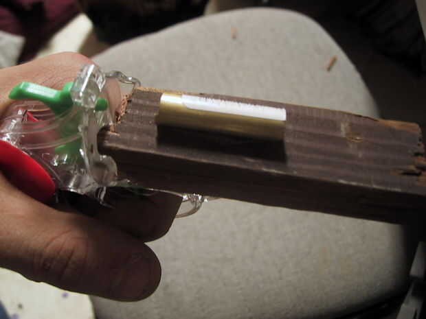 Airsofts deben incorporar, así que hice una versión de bolsillo de la SpudGun. Funciona como un spitball pero tiene un sistema de ignición. La pistola dispara BBs, papel, tejido o cualquier tipo de proyectil el le cabe en el interior es el barril. Pu
