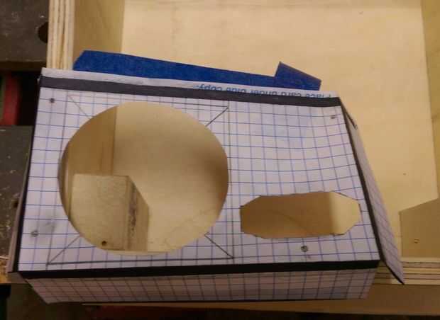 Las imágenes muestran la ubicación aproximada planificada de la alimentación, los dos agujeros que se necesitan (ventilador y cable de alimentación), la plantilla que se creó para marcar los agujeros hacia fuera y tras el corte del agujero. Como previamente mencionado, corte los orificios para la alimentación es probable que se más fácil haría antes la madera para la cubierta se ensambla. No quería tirar todo aparte, así que pulsa y terminó por picar la madera entre los dos agujeros. Parecía lo suficientemente malo como para mí que podría comprometer la capacidad que asegure el suministro en la vivienda, por lo que terminé remendando el daño con masilla para madera.