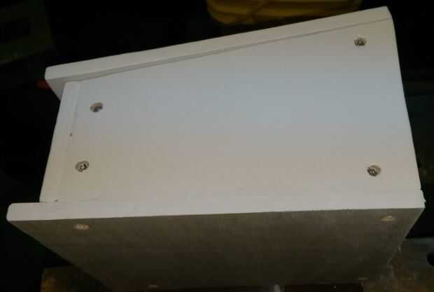 - [destornillador] Monte la placa para la tapa con los cuatro orificios de fijación previamente perforados y los cuatro tornillos de metal (u otro herraje elegido), que seguro que todos los cables a los terminales de alimentación a través del agujero en la tapa.