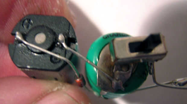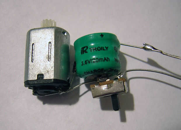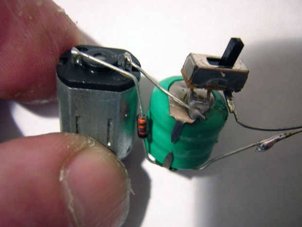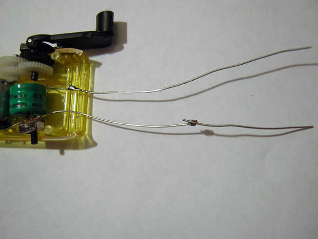 La terminal negativa del motor está conectada al borne negativo de la batería y luego se suelda un interruptor a conservar energía/energía cuando la batería no está en uso. Sin duda, podemos enrollar para arriba y recargar un bazillion veces, pero ¿por qué cuando no tenemos a? Conecte un cable largo o desde el final de "on" del interruptor deslizable.