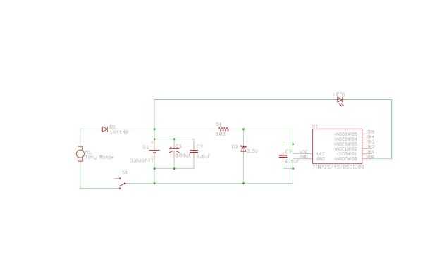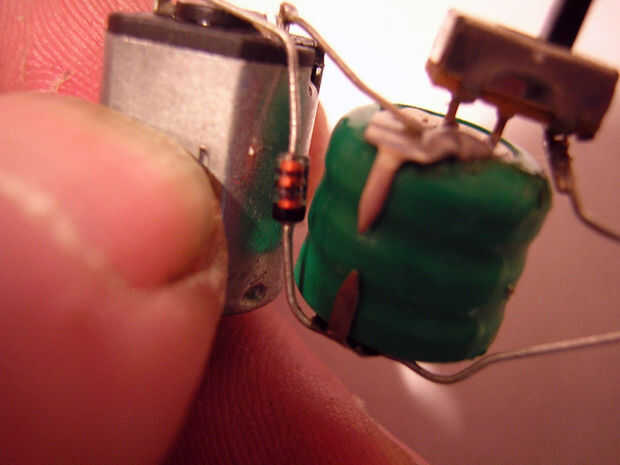 El motor está conectado al borne positivo de la batería a través de un diodo que gestiona back EMF cuando el motor se detiene repentinamente (es decir dejas de arranque). Un pequeño diodo de conmutación como el 1N4148 funciona bien para esta pequeña cantidad de voltaje y la corriente que nos veremos. Conecte un cable de largo/conexión desde el terminal positivo de la batería.