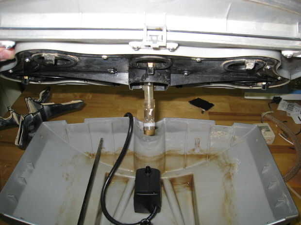 Esta parte no estaba tan emocionada con mis soluciones, pero hasta ahora está funcionando. La bomba en almacén encaja perfectamente dentro de la vivienda que fue quitada para acomodar la nueva bomba. La entrada de agua hasta el punto de distribución es una breve entrada cónica que parece sostener una manguera presionada contra él por fricción justa, aunque no todo lo que está bien. Colocando la bomba derecho bajo neath y cortar la pieza extra de manguera fue capaz de obtener el peso de la campana para mantener presión sobre cuando está cerrado. La bomba tiene tazas de la succión, por lo que ayuda a mantener en su lugar durante la colocación y le permite deslizarse.