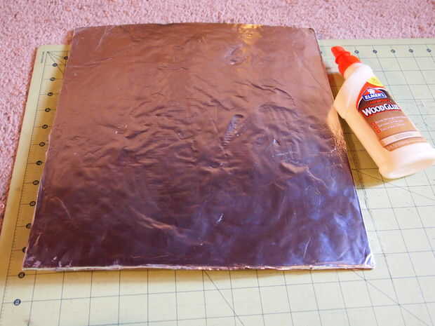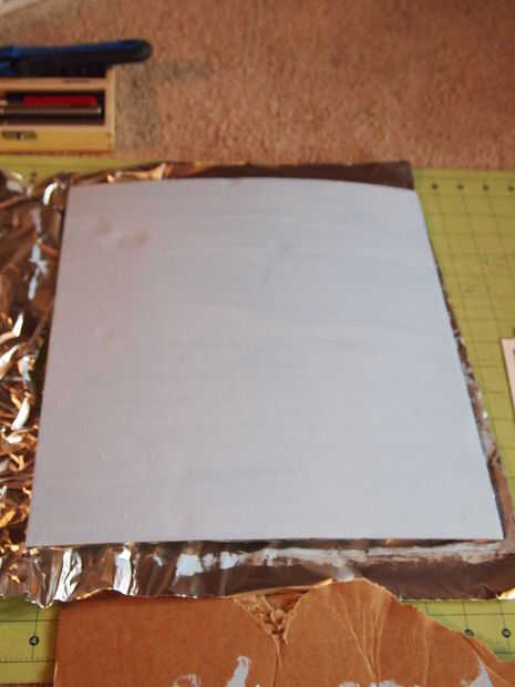 Primero usted tendrá que cortar un trozo de cartón 13 x 14 pulgadas. No hay ningún patrón para éste. Después de cortar hacia fuera, entonces usted querrá colocar papel de aluminio en la parte posterior de la misma. Utilicé mi cola para madera con moderación y une la lámina y alisó hacia fuera. Entonces, lo volcó y pintado. Si quieres decorar el frente con rotuladores o papel de construcción, no dude de hacerlo. Luego coloque a un lado deje que se seque.