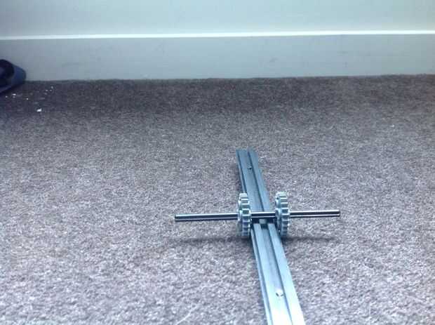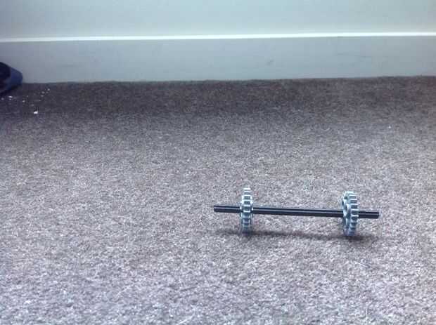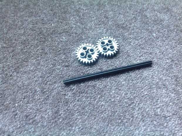 Para el gatillo necesita todas las piezas de Lego para este proyecto (el cross Polo y los engranajes). Deslice los dos engranajes el poste como en la foto de arriba. A continuación, utilice la columna vertebral de la carpeta para hacer una brecha en medio de los engranajes. No tiene que encaja, porque debe ser capaz también Deslice libremente solo la columna vertebral.
