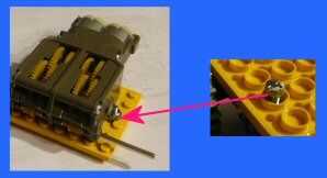 Montaje de los motores a la placa de montaje utilizando los tornillos incluidos con el kit de Tamiya. Perfore un agujero de la parte posterior a través del centro de la función de redondeo de Lego. Estos parecen alinearse perfectamente con los orificios del motor. Moler o presentar las cabezas de los tornillos para que ajustaban y al ras. Los ejes de salida se pegan hacia fuera apreciable.