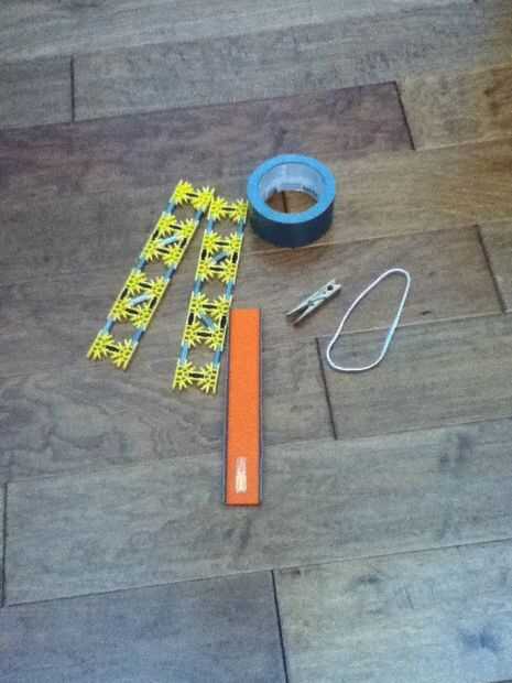 Necesita K'nex piezas, cinta adhesiva, una banda de goma, una pieza plana de plástico y un pin de ropa o clip.
