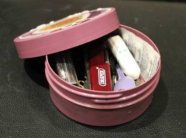 Por ejemplo con mi ' apocalypse' Tina decidí mantener las etiquetas en caso de alguna vez bolsa buscado; manteca corporal realmente no parece fuera de lugar en la mochila de una niña que significa puedo almacenar mi cuchillo suizo, pastillas potabilizadoras de agua, el fuego entrante, Sierra del alambre y otras baratijas. Pero con mis tinas que se utilizan para guardar objetos no sospechosos, me quité las etiquetas.