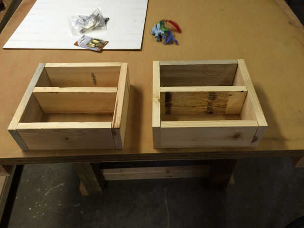 Mi esposa y encontré este estante de estilo vintage en una tienda, y decidió que necesitábamos otro para emparejar. (La primera espada y escudo del bebé es la copia.) Se hace muy simplemente con clavos del clavito, tablas de 1 x 4 y un tablón con cue