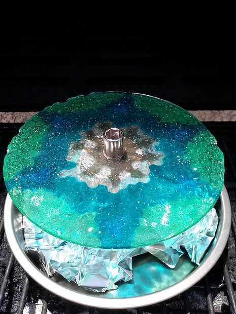 Solía un can y toma la forma de flor. Usé un casquillo de 1 pulgada porque era un poco más grande que la base de mi luz. Quieres espacio suficiente para la luz encajar en la base de la flor. También usé la lata en algunas flores, le da una base más amplia, pero no tienes tanta flor para cubrir la parte superior negra de la luz solar. He añadido que algunos de la hoja por debajo de mi poder porque la primera vez que la usé, el char interior fundido y negro transferida sobre mi siguiente flor. También, lugar de aluminio sobre la parte superior de su poder y el zócalo. Entonces usar esta hoja para ayudar a la forma de la flor. Si guarda la hoja de extensión abierta en lo que será la parte superior de la flor (la flor está boca abajo en la bandeja), la flor más abierta. Coloque los granos en la parrilla en la parte superior del molde que acaba de crear. Mantener un ojo en las cuentas. Puede tomar hasta 10 minutos en derretirse. Cuando ellos están fundidos, puede utilizar un guante para ayudar a darles forma en la forma que desee.