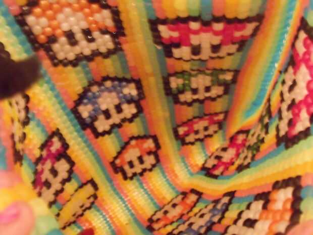 hecho dentro de 3 semanas. incluye arco iris metálico pony granos, perlas de pony de color sólido y los negros. Cuando he hecho haciendo el primer triángulo había hecho otro y atados a la mitad. Luego he trabajado mi manera alrededor para hacer la co