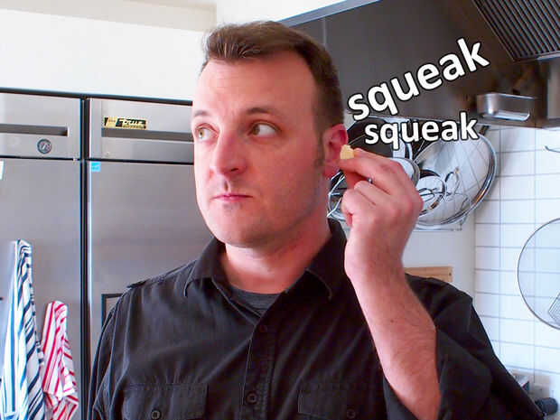Cuajada a veces se llama "queso chillón", ya que a veces hacen un ruido chirriante cuando frotó contra los dientes cuando se muerde en. Cuajada fresca chirrían más que envasados cuajada, para no ser demasiado deje si no lo encuentras fresco y la cuajada no rechina.