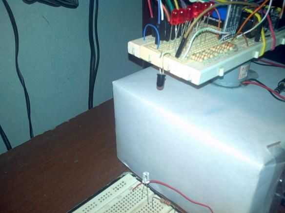 Como se dijo anteriormente, estos diodos Ninis en conjunto para detectar la posición, de esta manera, el diodo emisor de infrarojos se muestra inferior en parte de la (en el protoboard) está constantemente encendido, y el fotodiodo receptor se muestra de color café en la parte inferior del protoboard donde está montado el punto de vista cada vez pasa por el emisor , detecta la luz recibida y envía una señal al arduino para decirle empieze a "dibujar" las letras.