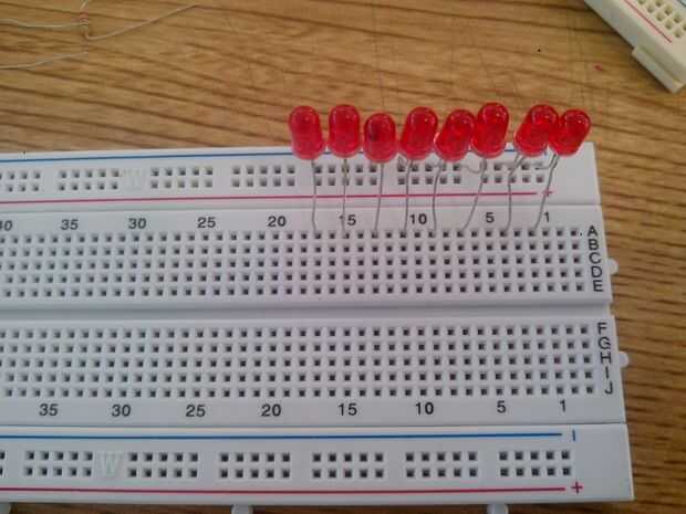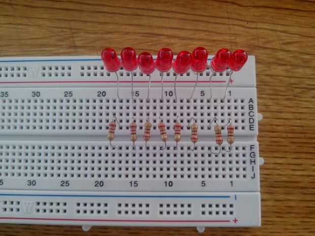 En primer lugar, instalaremos los LEDs en uno de los protoboards, en de tomando en consideración total serán 24 al momento de acomodarlos para quepan todos. A cada uno de los LEDs conectaremos una resistencia, esto con la finalidad de el voltaje llegue a los LEDs no sea demasiado alto y los queme.