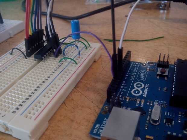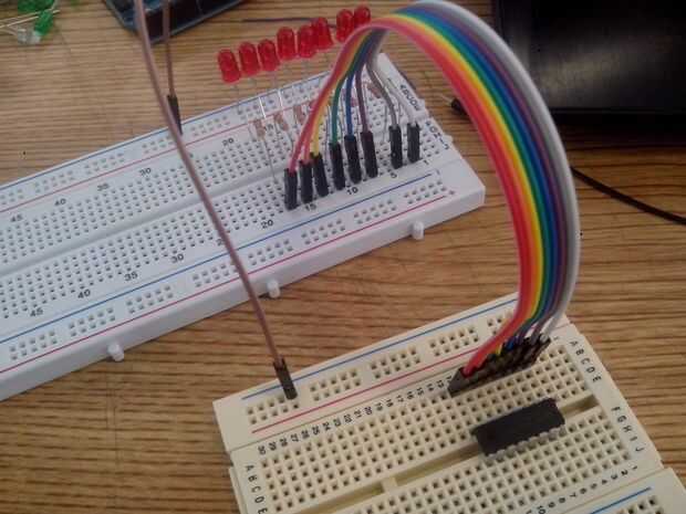 Tomando at cuenta el diagrama de la página de Arduino, conectaremos con puentes (cables de conexión) al otro protoboard, de esta manera tendremos más espacio para realizar conexiones. En el segundo protoboard se conecta el deun 74HC595 y el resto de los cables, mismos nos ayudaran a darle energía a los LEDs por parte del Arduino, u otra fuente de 5v, para los LEDs enciendan.