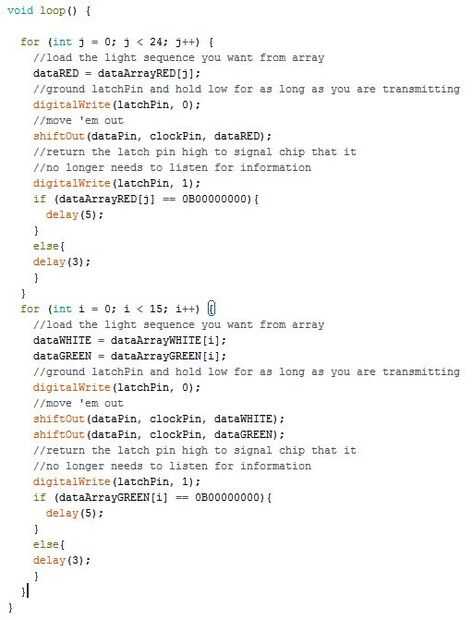 En de como de en el bucle principal podemos observar la base de ciclos para la secuencia programemos un los leds se repetirán una y otra vez cita los valores del retardo para al momento de tomar una fotografía de larga exposición mar capaz de capturar el dibujo.
