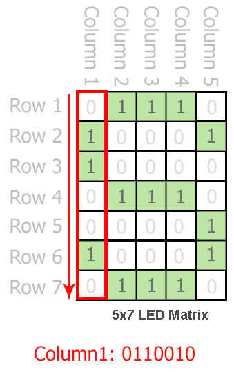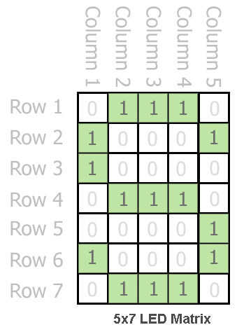 Asuma que está mostrando la letra "S" en una matriz de LED 5 x 7. Puede describir el estado de los LEDs de cada columna (de arriba a abajo) en binario como esta:
