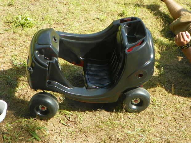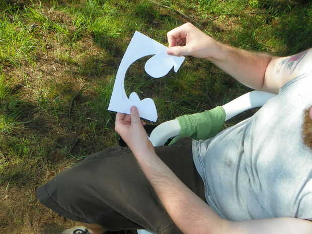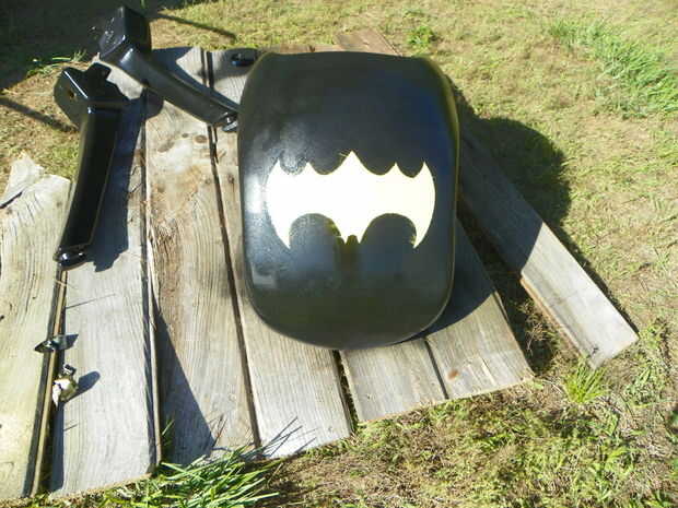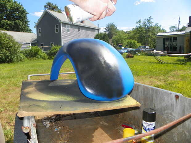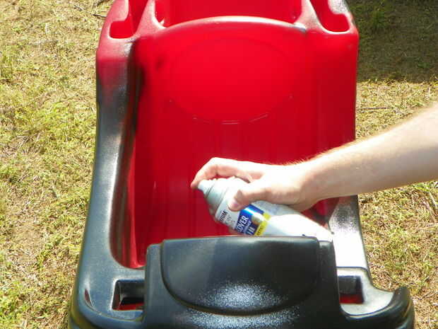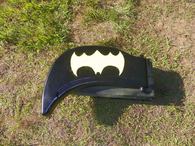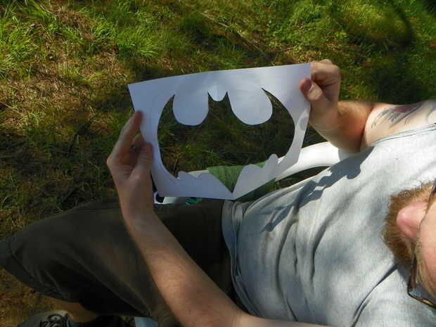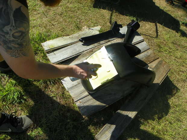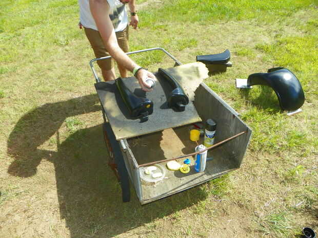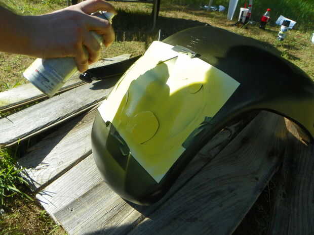 Una vez que todo el cuerpo es negro y seco es hora de agregar los logotipos en la parte superior y lateral. Tome un pedazo de papel y doblar por la mitad, dibujar el logotipo y recórtalo. Gratis entregué el logo luego recortar pero podría apenas como fácil imprimir un logotipo y recórtalo. Coloque el logo invertido con cinta de pintor y spray dentro con amarillo. dejar secar y repetir sobre el techo.