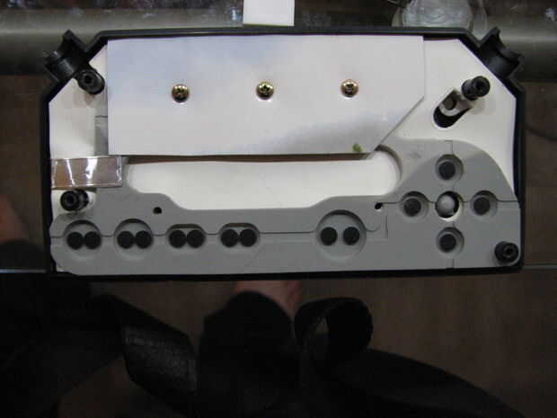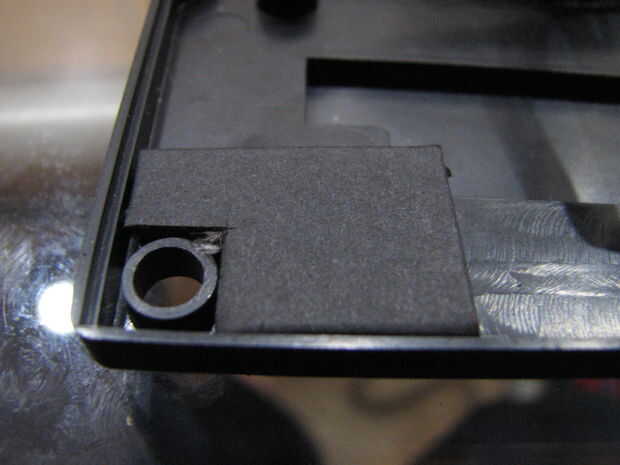 La Junta de la almohadilla de control también funciona un poco mejor si tiene unas cuñas a la prensa contra. Cortar dos trocitos de cartulina capas o mesa de trabajo y colocarlas en las esquinas inferiores de la caja de la muñeca, como en la foto.