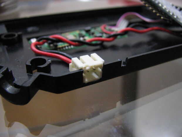 Cortar una muesca en la parte inferior la mitad del plástico de la caja de la muñeca, entre los agujeros para el paquete de cable principal y el cable que conecta a la consola. El tamaño para caber el clip de la batería. He incluido una foto de la mina.