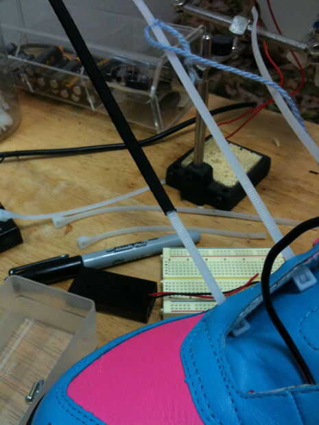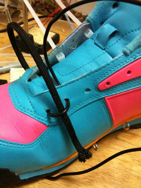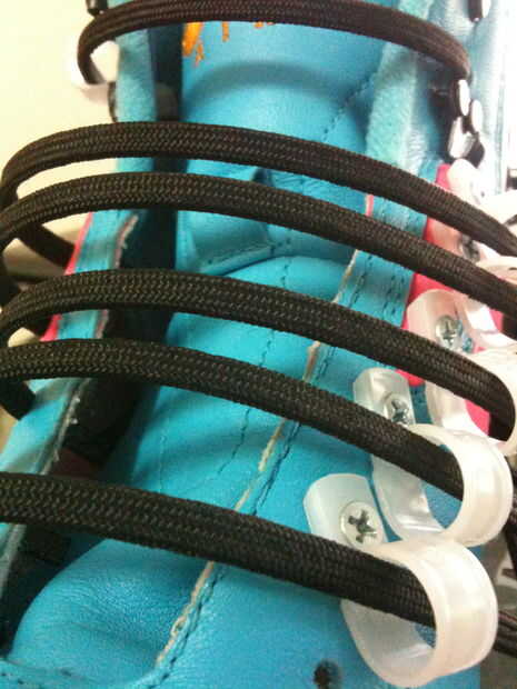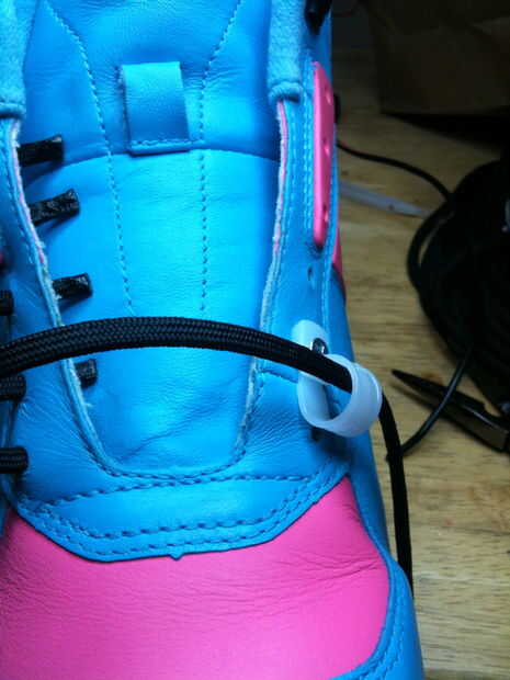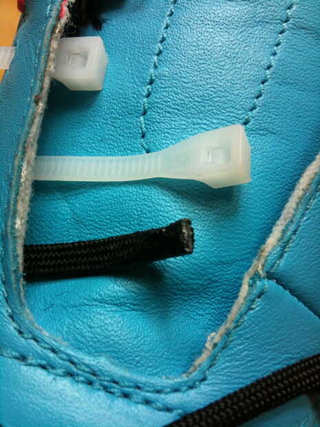 Ajuste las abrazaderas de plástico en los agujeros para los cordones a un lado. Ajuste en el 5, dejando un espacio entre cada amarra.