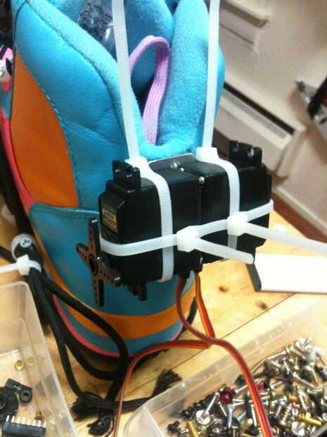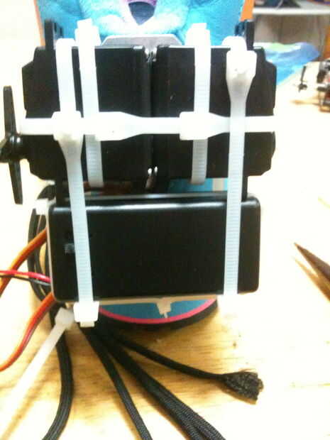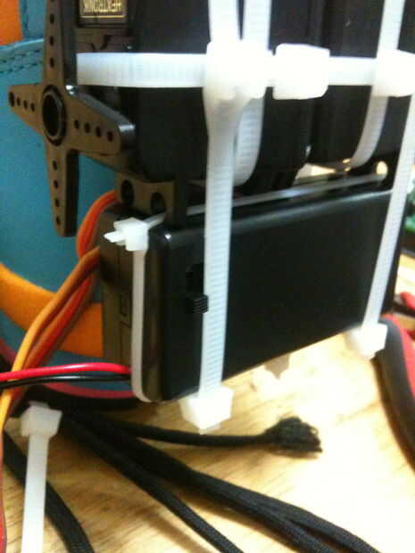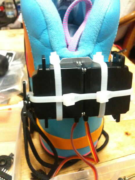 Tenga en cuenta que la mayoría de los lazos del hilo de rosca a través del espacio entre la placa y el zapato. Como mis lazos zip no lo suficiente en algunas áreas, había combinado dos juntos. Después de los servos en su lugar, cortado abajo los vínculos.