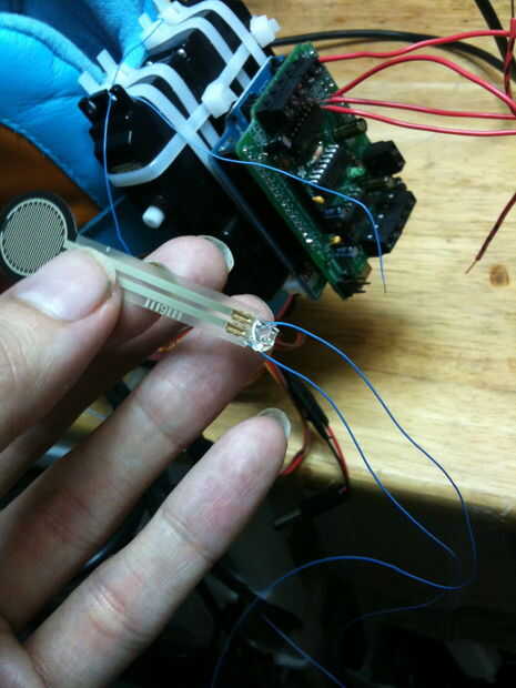 A continuación se monta el sensor de fuerza. Soldadura no se aconseja como el plástico puede derretirse, por lo que envuelve un alambre alrededor de los conductores y caliente había pegado en su lugar. El sensor entonces fue pegado y conducto grabado en la parte inferior de la zapata, justa donde descansaría mi talón.