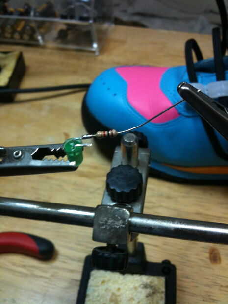 Finalmente, después de agarrar otro resistor y un poco de alambre de calibre medio, podemos comenzar soldar todo en su lugar: