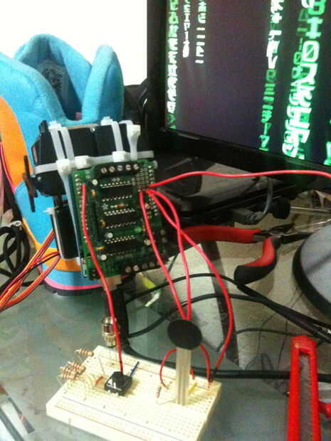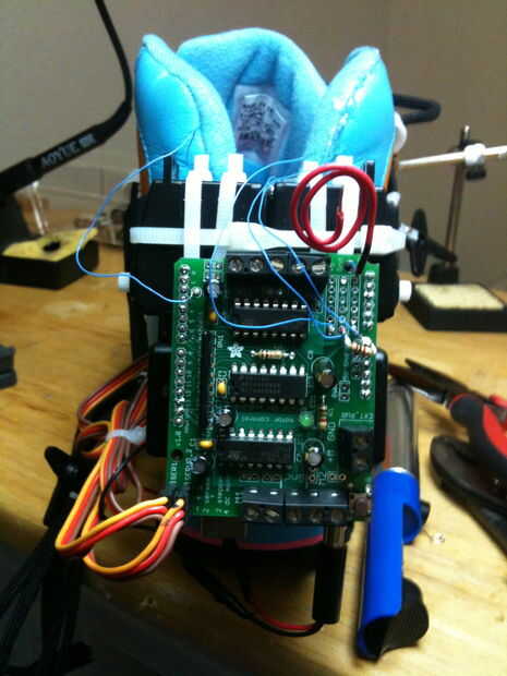 7.por último, conectar los servos, asegurándose de obtener la orientación correcta. Mi sketch de Arduino asume el servo de la izquierda (mirando desde atrás) está conectado al pin de servo más derecha, aunque esto puede cambiarse fácilmente en el software.