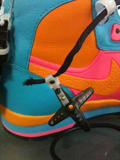 Utilizar abrazaderas de plástico para asegurar los cordones y unido a los brazos de servo, asegurándose de que los servos estén en la posición "unlaced". El bosquejo convertirá los servos 180 grados desde el punto de partida, apretar los cordones.