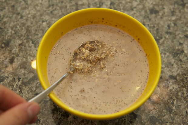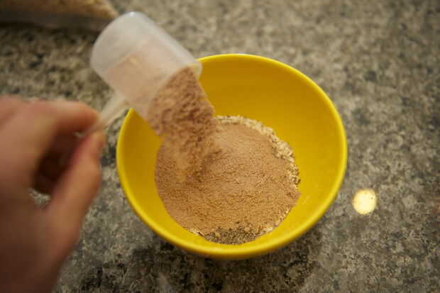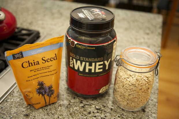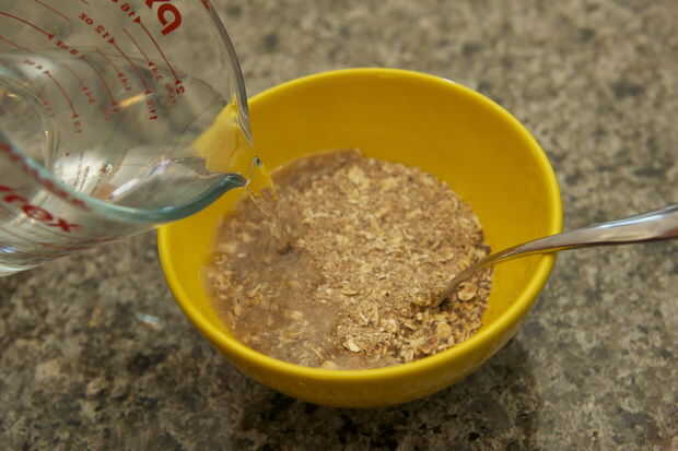 En un tazón de cereal para microondas, grande, mezcle la avena, proteína en polvo y semillas de chia. Añadir agua tibia sin embargo mucho como en la avena y revuelva hasta que totalmente se incorporan las semillas de la proteína en polvo y chia. Si usted terreno sus semillas de chia, puede que necesite añadir más agua porque absorben el agua y convertir en una sustancia gelatinosa. También, si se agrega agua hirviendo en lugar de agua tibia, el polvo de la proteína puede 'cuajar' y no se disuelven.