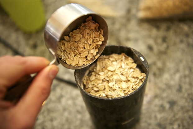 Si usted está usando avena arrollada, molerlos durante unos segundos en una procesadora o molinillo de café convertirlos en "cocción rápida" avena (apenas más pequeños, más rápido cocinar, copos de avena).